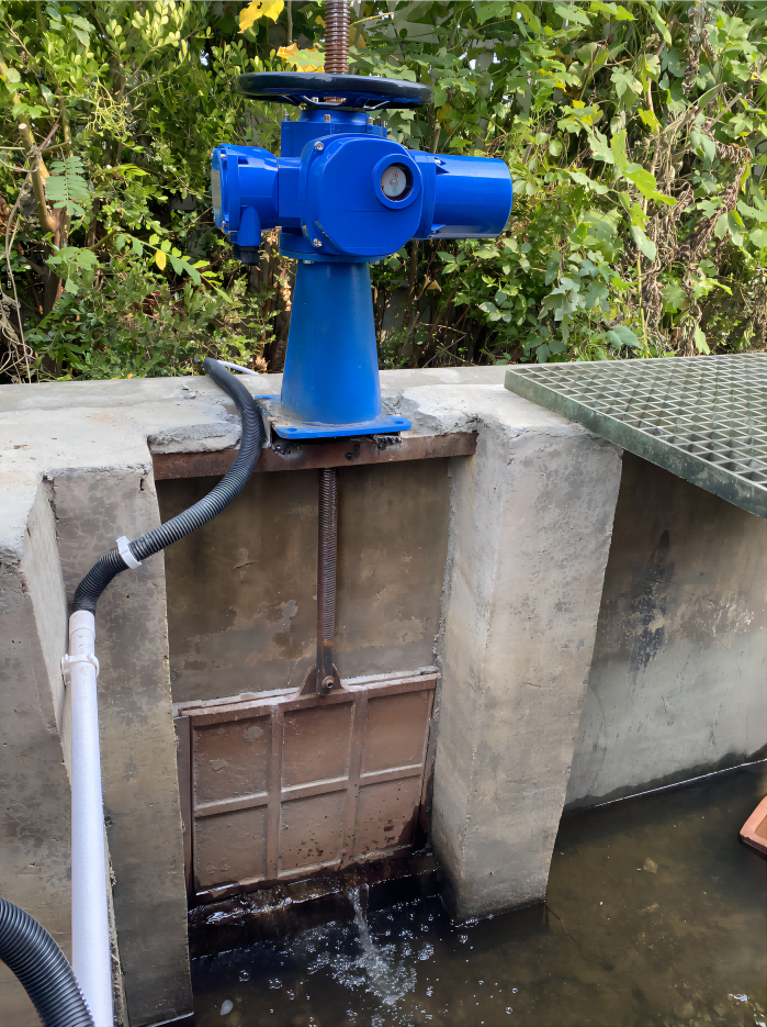 此處為手動圓盤式閘閥,改造需要把閘桿更換加裝電機,改造閘門可以遠程聯(lián)動控制啟閉。三個閘閥共用一個控制柜,節(jié)省成本,方便管理,安裝在泵房內(nèi),不易破壞。泵房內(nèi),兩臺25kw的水泵控制直接啟動,為實現(xiàn)自動化及保護水泵,采用軟啟動控制柜,更穩(wěn)定,不容易出故障。