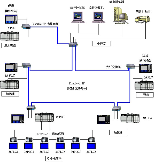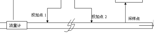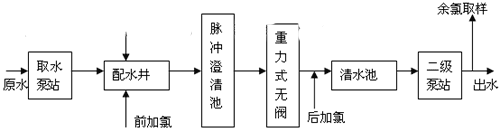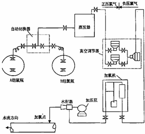 圖2 加氯工作流程圖 如圖2示:前加氯系統與后加氯系統共用一個氯氣氣源,共設兩組供氯氯瓶,兩組氯瓶互為備用.,根據氣瓶壓力自動切換。如當正在使用的一組氯瓶出口管上的壓力小于某個值時,壓力式自動切換器將自動切換到另一組氯瓶,保證連續供氯。在加氯自動控制系統中,將PLC的模擬量輸出信號送給加氯機的模擬量輸入端,通過控制加氯機中執行器的動作,控制水射器中的真空度,進而控制了加氯量的大小。加氯自動控制系統中還包括氯氣氣源的自動切換,漏氣自動報警和漏氯吸收裝置的自動控制。在加氯自動控制系統中,關鍵是對加氯機的控制。 自動控制氯系統可進一步配備計算機數據采集系統,以便實現加氯間無人值班目標。把出廠水中的余氯分析儀測定的數據送到加氯間,中心化驗室和調度室,以便值班人員可隨時監測出廠水余氯值和調整余氯設定值。 3影響加氯自動控制的主要原因(1)采樣時間 采樣時間的長短,直接影響加氯的效果。為了達到自動控制的目的,要求氯氣經充分混合后馬上檢查余氯值作為復合環控制的反饋信號。但現場中,有的工藝設計將混合接觸時間定的太長,對控制系統來說,即意味著純滯后時間的延長,造成測定結果不準確。因此,在后加氯的投加點和采樣點的選擇上,工藝設計時應充分考慮自動控制的要求。通常情況下,后加氯在清水池進水管上,在氯氣與水充分混合后應在盡可能短的時間內取樣,水經過加氯點到余氯分析儀處的水流時間一般不要超過5分鐘,在水與氯氣充分混合的前提下取樣時間越短越好??捎萌缦露N方法論縮短取樣時間:一是縮短取樣管的長度;二是加快取樣管中的水流速度如加大取樣水管排水分流管。(2)檢測設備 余氯分析儀的檢測值的正確性也是控制加氯的關鍵。由于余氯分析儀存在零點漂移,應定期進行校正。同時在軟件編制時,對信號數據的處理也可考慮濾波、穩定等形式進行適當處理以增加數據的可靠性。(3)信號傳輸 主要是各底層設備的檢測信號要及時準確的傳輸到PLC中,然后進行處理?,F場中大都設備采用標準電流信號(0―20mA或4―20mA)。4 自動加氯系統的應用 南方某一水廠,以江水為水源,水廠原設計規模為6萬m3/d。工藝流程如下示: